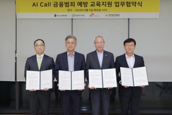 SK텔레콤은 `AI콜`을 활용한 금융범죄 예방교육 본격 추진을 위해 카카오뱅크, 밀알복지재단, 경기남부경찰청과 양해각서(MOU)를 체결했다고 6일 밝혔다.