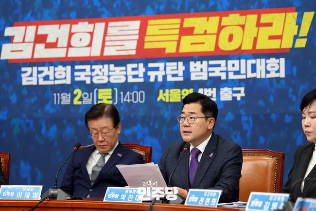 더불어민주당 박찬대 원내대표는 10월 31일 오전 국회 본청 원내대표회의실에서 긴급 기자회견을 열고, 윤석열 대통령이 불법적으로 공천에 개입했다는 육성 증거를 확보했다고 주장했다.
