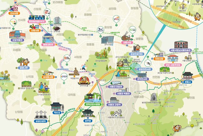 관악구가 지역 내 랜드마크와 관광명소를 쉽게 찾고, 문화유산을 한 눈에 볼 수 있는 `관악구 관광안내지도`를 제작했다. 이미지는 `관악구 관광안내지도` 중 일부