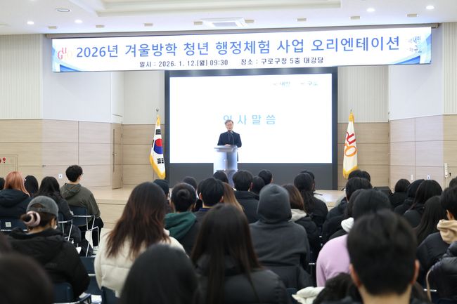 겨울방학 청년 행정체험사업 오리엔테이션에서 장인홍 구로구청장이 인사말을 하고 있다.구로구(구청장 장인홍)는 12일 구청 강당에서 ‘2026년 겨울방학 청년 행정체험사업’ 오리엔테이션을 열고 사업의 본격적인 시작을 알렸다. 이날 행사는 참여 청년들에게 사업 취지와 운영 방향을 공유하고, 행정체험 기간 동안의 역할과 유의사항을 안내하기 위해 마련됐다.