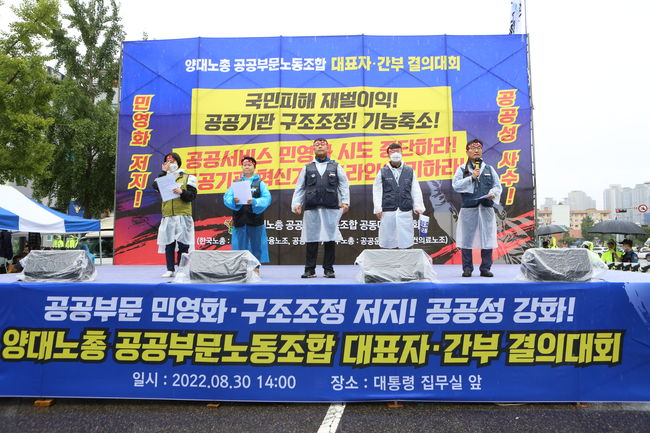 민주노총과 한국노총, 양대노총 공공부문노동조합 공공대책위원회(공대위)는 30일 서울 용산 전쟁기념관 인근에서 `조합간부 결의대회`를 열었다. 이날 결의대회에서 참가자들은 정부의 공공기관 구조조정·민영화 저지와 공공성 강화를 촉구하고 나섰다.