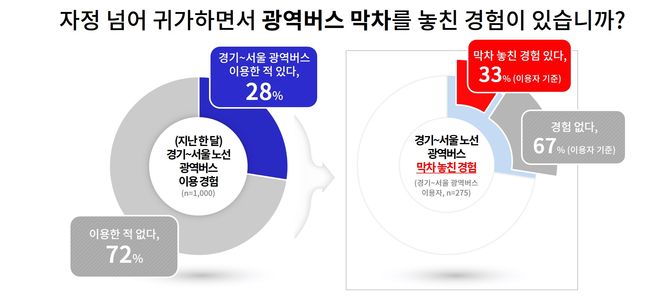 이번 조사에서 응답자의 28%는 최근 한 달 기준으로 경기와 서울을 오가는 광역버스를 이용한 적이 있는 것으로 나타났는데, 이들(275명) 중 33%는 자정 넘어 귀가하면서 광역버스 운행이 종료돼 ‘막차를 놓친 경험이 있다’고 답했다.