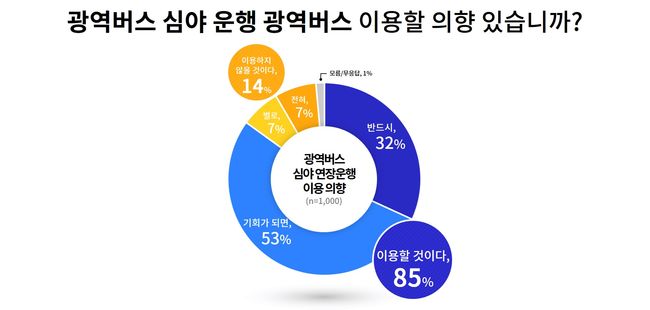 응답자 85%는 야근이나 개인 일정 등으로 자정 이후 귀가할 때 심야 시간 운행되는 광역버스가 있다면 해당 노선의 광역버스를 ‘이용할 것’이라는 의향을 밝혔다.