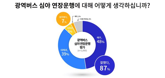 경기도민의 87%가 경기도의 광역버스 심야 연장 운행 결정을 긍정적으로 평가한다는 조사 결과가 나왔다고 밝혔다.