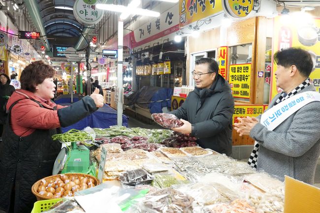 전통시장에 방문한 중랑구청장.중랑구는 설 명절을 앞두고 2월 4일부터 11일까지 지역 전통시장 7곳과 골목형상점가 1곳을 방문해 전통시장 장보기 행사를 진행한다고 6일 밝혔다. 이번 행사는 명절을 맞아 전통시장 이용을 독려하고 상인들과 직접 소통해 지역 상권에 활력을 불어넣기 위해 마련됐다.