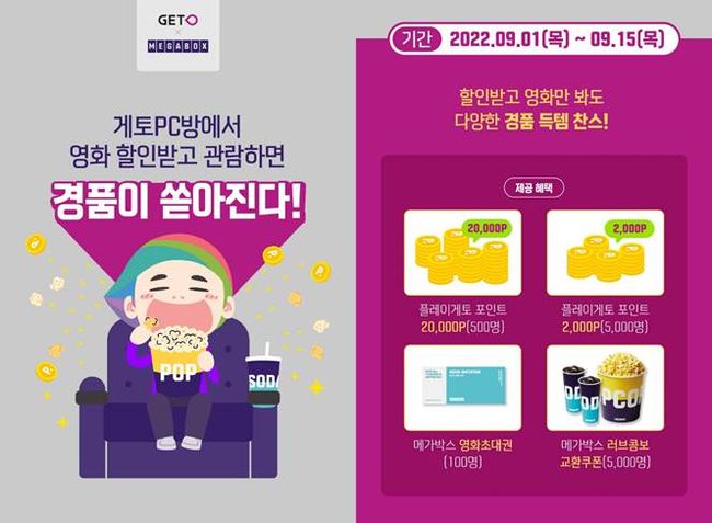 메가박스와 게토피시방은 영화예매 서비스 론칭을 기념하고자 9월 1일부터 15일까지 푸짐한 경품 이벤트를 진행한다. 게토피시방 영화 예매 서비스를 통해 관람을 완료한 고객은 자동으로 경품 이벤트에 응모된다. 추첨을 통해 일반 초대권(1백 매), 러브콤보 교환권(5천 매), 플레이게토 포인트 2만 포인트(5백 명), 플레이게토 포인트 2천 포인트(5천 명)를 제공할 예정이다. 당첨자는 9월 20일 메가박스 웹/앱 당첨자발표 페이지 및 Play GetO 앱에서 확인할 수 있다.