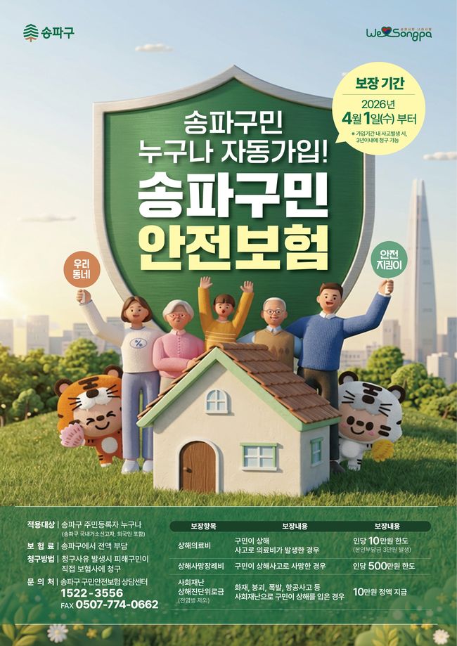 송파구민 안전보험 포스터.송파구는 4월 1일부터 `송파구민 안전보험`을 시행한다고 밝혔다. 송파구에 주민등록을 둔 모든 구민이 대상이며, 국내 거소 신고자와 등록 외국인도 포함된다.