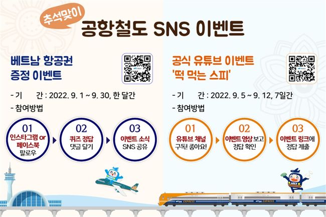 첫 번째 이벤트는 공항철도와 베트남항공이 공동으로 진행하는 SNS 퀴즈 댓글 이벤트로, 9월 1일부터 30일까지 한 달 간 공항철도 공식 인스타그램과 페이스북에서 진행된다.