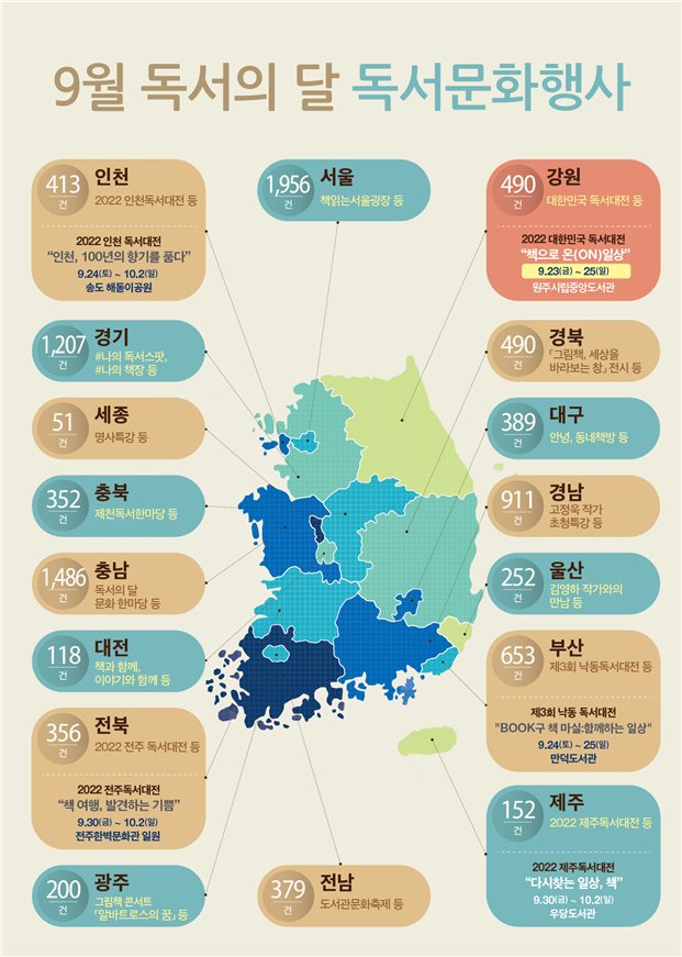 문체부 정책 담당자는 “9월 독서의 달을 맞이해 우리 주변에서 열리는 다양하고 흥미로운 독서문화 행사에 가족, 친구들과 함께 참여해 책 읽는 즐거움을 나누고 독서활동을 꾸준하게 이어가길 바란다”고 밝혔다.