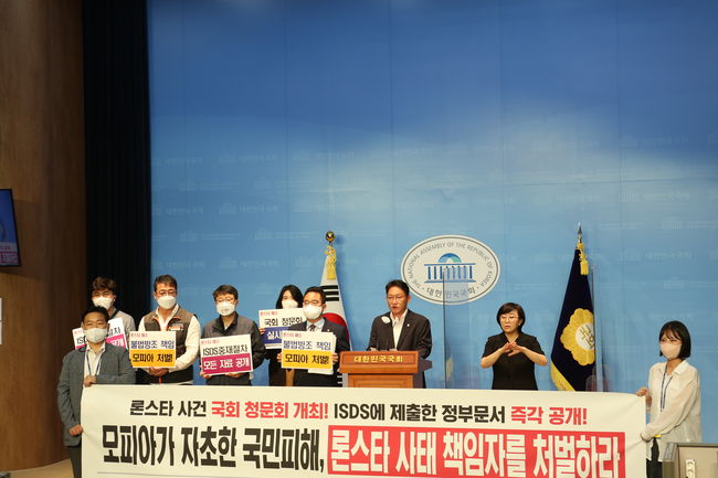 배진교 정의당 의원은 1일 국회 소통관에서 민병덕 더불어민주당 의원, 경제 관련 시민단체들과 공동기자회견을 갖고 론스타 배상 결정에 대한 입장을 밝혔다.배 의원은 이날 기자회견에서 "결론부터 이야기하면 론스타에게 단 한푼의 국민혈세도 지불하게 해서는 안 된다. 잘못은 모피아(재무부와 마피아의 합성어)가 저질렀는데 국민 혈세로 배상할 수 없다"고 강조했다.