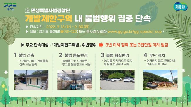 경기도 특별사법경찰단이 9월 13일부터 30일까지 개발제한구역 내 무허가 건축, 불법 용도변경 등 불법행위를 집중 단속한다.