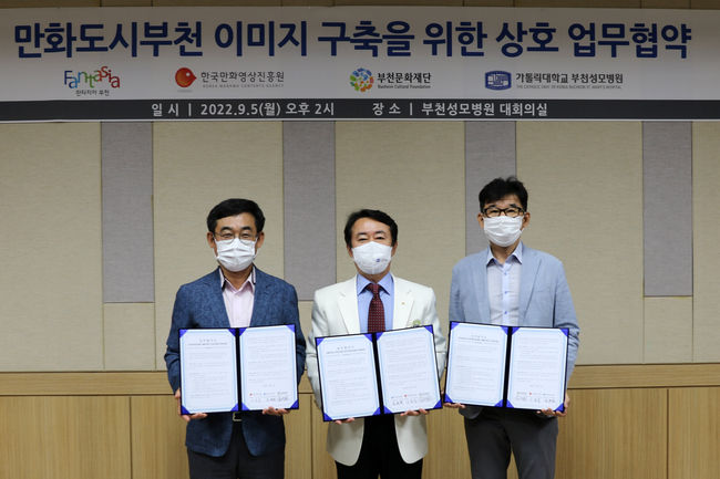 부천문화재단은 한국만화영상진흥원, 가톨릭대학교 부천성모병원과 9월 5일(월) 오후 2시 부천성모병원 대회의실에서 만화도시 부천 조성을 위한 업무협약을 맺었다.