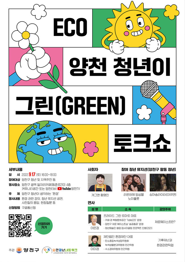 ‘ECO 양천 청년이 그린(GREEN) 토크쇼’ 참여를 희망하는 구민은 오는 16일까지 구글폼에서 신청할 수 있으며, 신청 시 질의응답 코너에 활용할 사전 질문도 함께 접수할 예정이다.