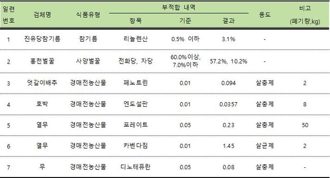 검사 결과 잔류농약 기준치 초과가 5건, 리놀렌산 기준을 초과해 진위가 의심되는 참기름 1건, 전화당(벌꿀 원액 성분)은 덜 들어가고 자당(식품첨가물 성분)은 과하게 섞은 벌꿀 1건 등 총 7건이 부적합 판정을 받았다. 이 밖에 식중독균, 중금속, 방사능에 대한 안전성 검사는 모두 기준에 적합했다.