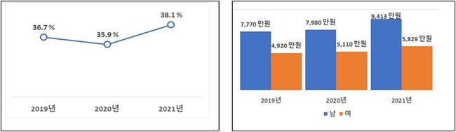 2021년 성별임금격차 상장법인 38.1%, 공공기관 26.3%