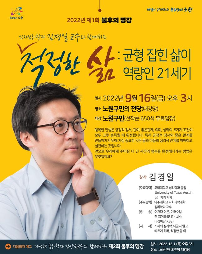 오는 16일 오후 3시에 진행되는 2022년 제1회 불후의 명강에서는 인지심리학자 김경일 교수가 ‘적정한 삶-균형잡힌 삶이 역량인 21세기’라는 주제로 강연을 진행한다.