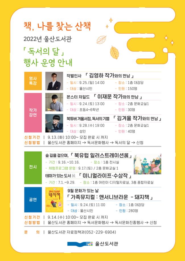‘책, 나를 찾는 산책’9월 독서의 달 행사‘풍성’ - 명사 특강, 작가 강연, 공연, 기획 전시 등