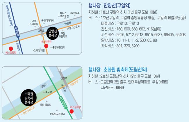 안양천 빛축제가 열리는 생태초화원에서는 오후 5시부터 오후 10시까지 3일간 버스킹 공연이 예정돼 있다. 인라인스케이트장에서는 어린이 가족 관람객을 위한 어린이테마파크(놀이시설)와 청소년 보드게임대회가 열린다.