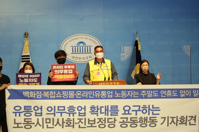 이날 기자회견에서 참가자들은 "유통노동자에게 휴식권은 언제나 심각한 문제였다. 물건을 파는 노동자가 아니라 돈을 더 많이 벌려는 유통자본의 요구가 언제나 우선됐기 때문"이라고 주장했다.