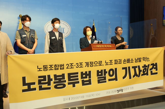 정의당 이은주 의원은 15일 국회 소통관에서 기자회견을 갖고 `노란봉투법`을 대표 발의한다고 밝혔다.