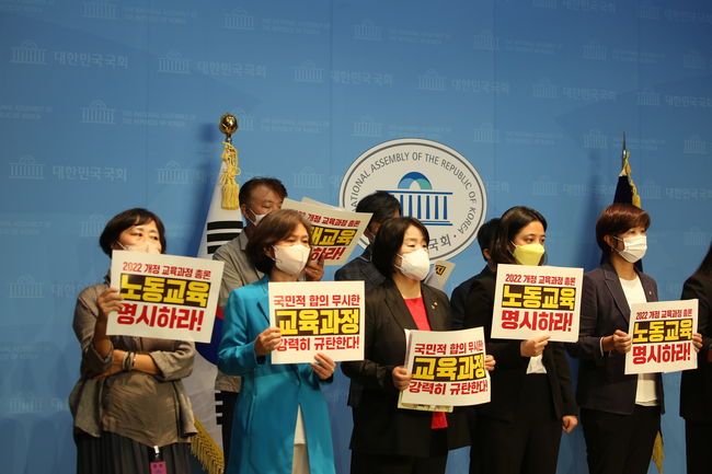 류호정 · 강민정 · 윤미향 · 민형배 의원과 곽노현 전 서울시교육감, 박은경 서울교육단체협의회 상임대표, 임성무 환경과 생명을 지키는 전국교사모임, 김지영 민주시민교육교원노동조합 위원장 등은 15일 국회 소통관에서 기자회견을 열고 교육과정 총론 개악에 대해 규탄했다.이들은 "작년 주요사항 발표 당시 환경생태교육, 민주시민교육, 일과 노동에 포함된 의미와 가치를 교육목표에 반영하겠다며 반영 예시까지 제시했지만, 어느 것 하나 제대로 반영된 것이 없다"고 비판했다.