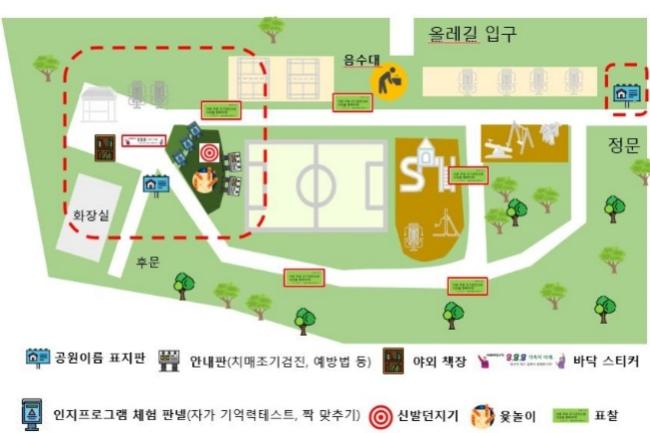 온수체육공원 내 마련된 ‘기억튼튼공원’은 공원을 이용하는 다양한 연령층에게 손쉽게 치매에 대한 정보와 치매 관련 프로그램 체험 기회를 제공하기 위해 조성됐다.
