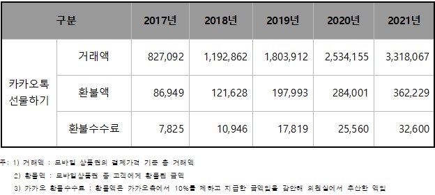 카카오톡 선물하기를 통한 거래액이 급증해 지난해 3조 3천억원을 기록한 가운데, 카카오가 모바일상품권 환불금액에 대한 10%에 달하는 과도한 수수료로 인한 지적이 잇다르자 환불 수수료 관련 개선방안에 나섰다.