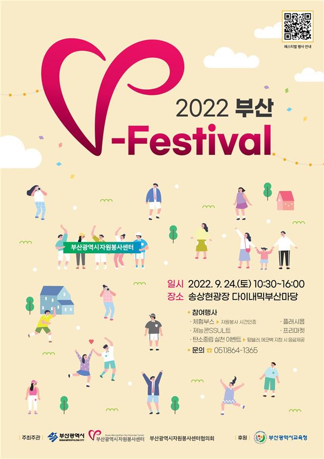 부산시(시장 박형준)와 부산광역시자원봉사센터는 9월 24일 10시 30분부터 송상현광장 다이내믹부산마당에서 ‘2022 부산 V-Festival’을 개최한다고 밝혔다.