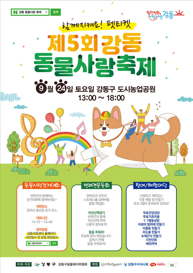 ‘숲길 함께 걷개’ 오는 24일, 강동구 동물사랑 대축제 열린다 - 24일 오후 1~6시, 일자산 도시농업공원에서 열리는 반려동물 문화축제 - 반려동물과 숲길걷기대회부터 무료 건강상담·행동교정·기초미용 등 체험부스 운영