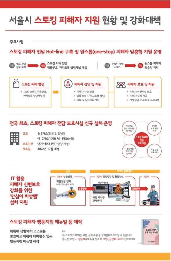 서울시는 스토킹 피해자를 위한 ‘행동지침 매뉴얼(설명서)’을 개발·배포해 피해자 스스로 행동 지침 수립을 통해 피해자 스스로 위협에 보호하고 대비하는 능력을 높이도록 지원한다.