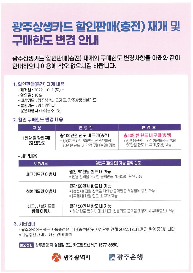 박정환 시 경제창업실장은 “상생카드 할인발행 재개를 많은 시민들이 기다려왔다”며 “지역 소상공인과 지역경제에 도움을 주는 광주상생카드 활성화를 위해 더욱 노력하겠다”고 말했다.