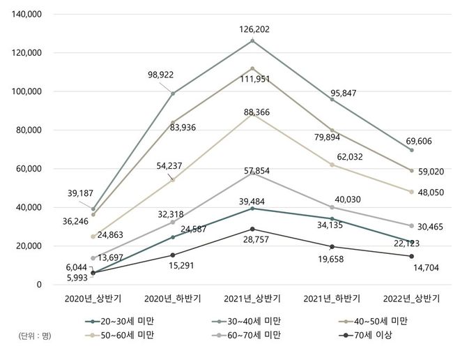 2020년부터 2021년까지 집값 폭등의 최고점 시기에 20대 주택구매자는 5,993명에서 3만 9,484명으로 7배 가까이 늘어났다. 같은 시기에 전체 주택구매자가 약 3배 정도 늘어난 것과 비교하면, 20대가 매우 급격하게 주택시장에 뛰어들었음을 알 수 있다.