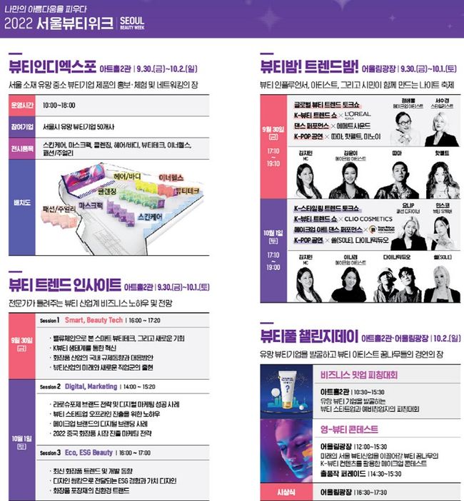 `뷰티산업의 낮과 글로벌 축제의 밤`…뷰티산업 축제 30일 개막 - 9.30.~10.2. 3일간 서울의 최신 경향 선보이고 케이(K)-뷰티와 한류 즐기는 글로벌 축제 첫 개막 - 유망 브랜드 전시, 전문가 강연, 수출상담, 혁신 아이디어 피칭대회 등 뷰티산업 비즈니스의 장 마련 - 저녁에는 뷰티문화와 한류를 즐길 수 있는 ‘축제의 밤’으로 구성, 시민들과 함께 어우러진다