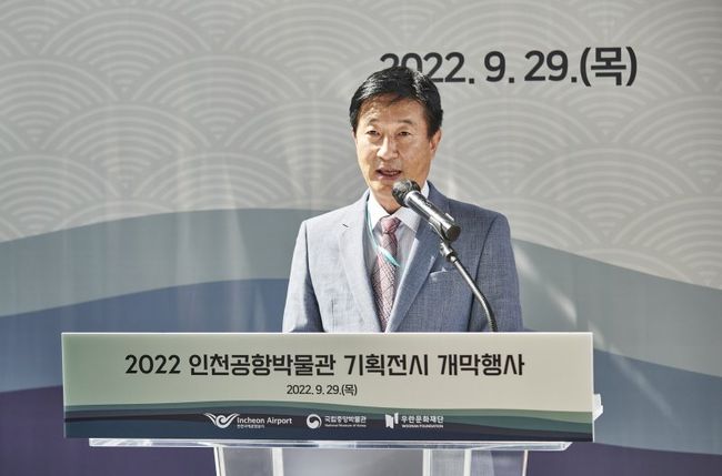 인천국제공항공사는 지난 29일부터 국립중앙박물관과 우란문화재단과 협업하여 제1여객터미널 탑승동 인천공항박물관에 기획전시를 선보인다. 사진은 29일 인천공항 제1여객터미널 탑승동에서 개최된 개막행사에서 인천국제공항공사 류진형 운영본부장이 개회사를 하고 있는 모습.