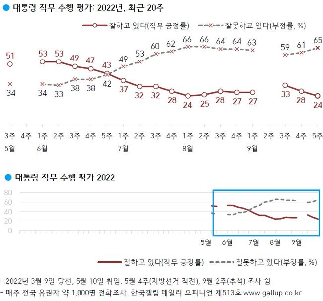 한국갤럽이 2022년 9월 다섯째 주(27~29일) 전국 만 18세 이상 1,000명에게 윤석열 대통령이 현재 대통령으로서의 직무를 잘 수행하고 있다고 보는지 잘못 수행하고 있다고 보는지 물은 결과, 24%가 긍정 평가했고 65%는 부정 평가했으며 그 외는 의견을 유보했다(어느 쪽도 아님 3%, 모름/응답거절 8%).