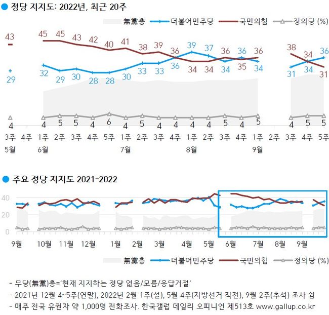 3월 대통령선거 직전부터 5월 첫째 주까지 양당 지지도가 비등했으나, 윤석열 대통령 취임과 함께 국민의힘은 상승하고 더불어민주당은 하락해 격차가 커졌다. 국민의힘은 6월 지방선거 이후 점진 하락, 더불어민주당은 30% 안팎에 머물다 상승해 7월 말부터 추석 전까지 엎치락뒤치락했다.