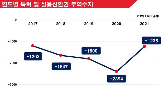 문화예술분야가 약진한 것과 달리 국내 기업들이 해외 국가들의 원천기술을 사용할 때 지불하는 ‘특허 및 실용신안권’분야는 아직 만성 적자에 빠져있다. 2020년 약 23억 9400만달러에서 2021년 약 12억 3500만달러로 적자 규모를 개선했지만 이는 국내 대기업의 특허 및 실용신안권 수출이 증가한 영향에서 비롯된 것으로 중소·중견 기업의 산업재산 수준은 제자리걸음이거나 오히려 악화되고 있다는 분석이다.