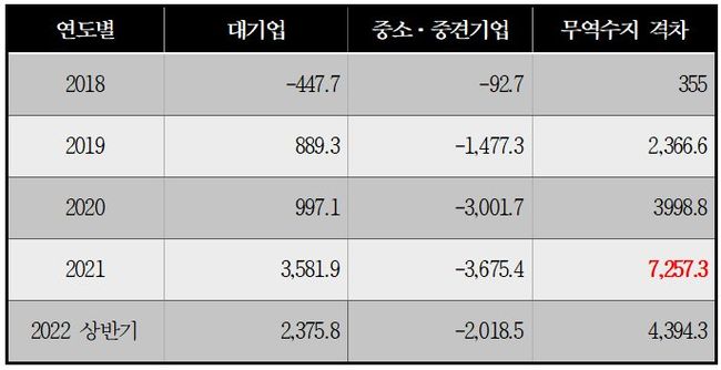 22년 상반기 지식재산권 무역수지에서도 대기업은 약 23억 7600만달러의 흑자를 기록하며 전년 동기 대비 약 3억 7000만달러정도 흑자 폭이 증가한 반면 중소·중견기업은 약 20억 1800만달러의 적자를 기록하며 전년 동기 대비 약 2억 2000만달러 적자 폭이 늘어났다. 이미 상반기에만 대·중소기업 간 격차가 40억달러 이상 벌어진 것이다.