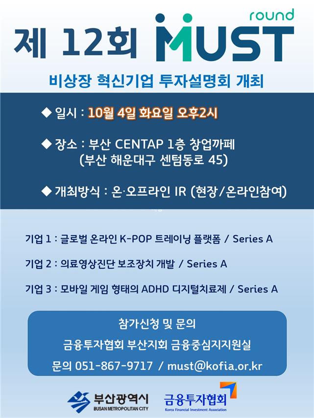 부산시와 금융투자협회는 오는 10월 4일 오후 2시 센텀기술창업타운(CENTAP)에서 「제12회 머스트 라운드(MUST ROUND)」 투자설명회를 개최한다고 밝혔다.