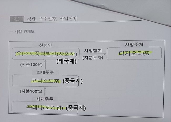 조도풍력발전의 모회사는 레나로 중국의 국영기업인 차이나에너지 그룹의 한국지사장으로 알려진 인물이 대표로 있는 중국계 기업으로 분류된다. 이번 계약으로 자본금 1,000만원인 더지오디는 자본금 대비 수익이 7,400배가 넘는 720억원에 달할 것으로 알려졌다.
