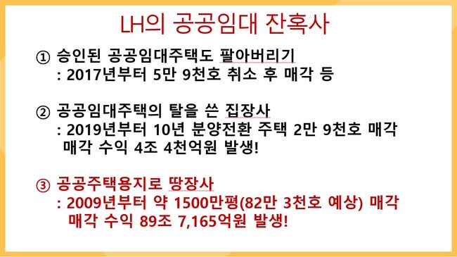 토지임대부 주택 재고와 국공유지 분양특례를 요구하는 이번 문건 공개로 LH의 주요관심사는 주거약자를 위한 공공임대주택 정책을 축소하고, 부동산 매각을 통한 수익 확보에 집중하는 것임이 확인됐다.