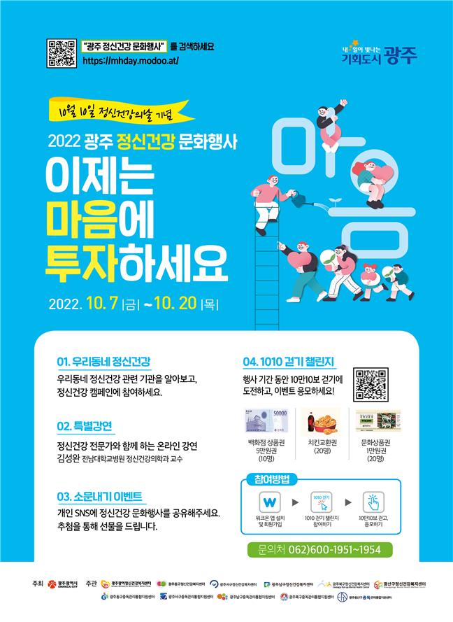 광주시가 주최하고 광주광역정신건강복지센터, 5개구 정신건강복지센터, 5개구 중독관리통합지원센터가 공동으로 주관하는 이번 행사는 ‘이제는 마음에 투자하세요’라는 주제로, 정신건강 홍보주간(10월7일~10월20일) 진행되며, 온·오프라인에서 동시에 참여할 수 있다.
