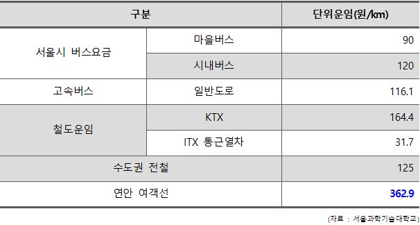 또한, 항공, 버스, 기차 등의 기타 대중교통의 단위 운임과 비교했을 때 연안여객선 운임은 수도권 전철의 3배, ITX 통근열차의 10배, 고속버스의 3배에 달하는 등 다른 교통수단에 비해 운임이 가장 높은 상황이다.