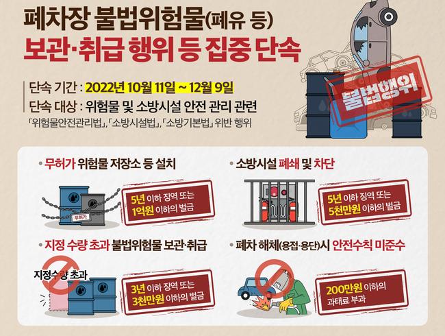 경기도 특별사법경찰단이 10월 11일부터 12월 9일까지 도내 폐차장을 대상으로 위험물 안전관리, 소방시설에 대한 위법행위를 집중 단속한다.