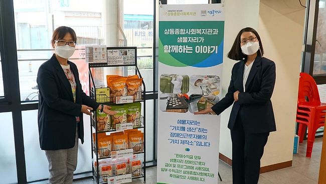 협약에 따라 샘물자리에서 생산하는 누룽지와 국수 무인판매대가 상동종합사회복지관에 설치됐다. 이에 대한 수익은 장애인고용유지와 지역사회 취약계층 지원을 위해 사용될 예정이다.