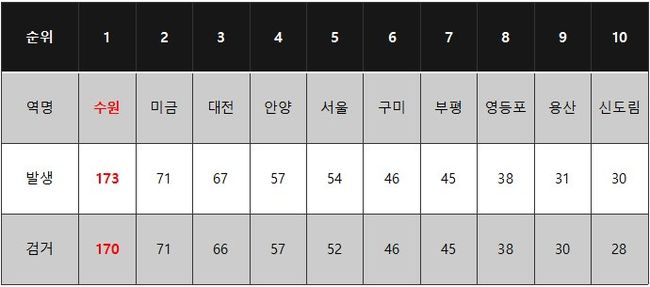 2017년 이후 가장 많은 성범죄가 발생한 역사는 수원역 173건으로, 이는 두 번째로 성범죄가 많이 발생한 역사인 미금역의 71건보다 2.4배가 높아 대책이 시급한 것으로 확인됐다. 세 번째는 대전역(67건), 네 번째는 안양역(57건), 다섯 번째는 서울역(54건)으로 철도역사 내 성범죄가 많이 발생했다.