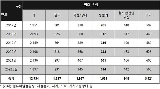 구체적으로 최근 5년여간(2017-2022.8) 철도범죄는 총 12,734건이 발생했고, 성범죄 36.4%(4,631건), 점유이탈물횡령, 재물손괴 등 기타범죄 30.8%(3,921건), 상해·폭행 15.6%(1,987건), 절도 14.4%(1,837건), 철도차량 파손, 승무원 직무 방해 등 철도안전법 위반 7.4%(948건) 순이다.