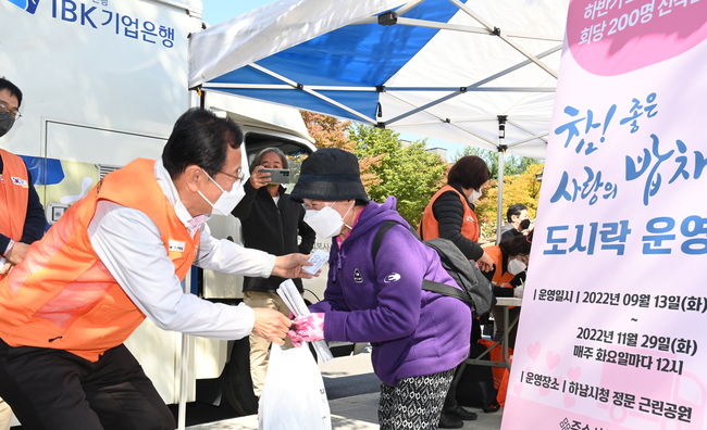 이현재 하남시장이 11일 취임 100일을 기념해 복지 사각지대에 놓인 이웃을 돕는 `사랑의 밥차` 배식 봉사에 나섰다.