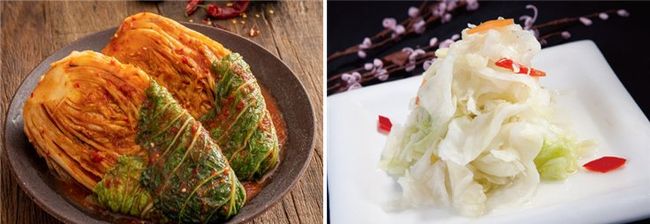 한국 김치(사진 왼쪽)와 중국 파오차이(오른쪽) 비교(세계김치연구소 자료 중 일부)