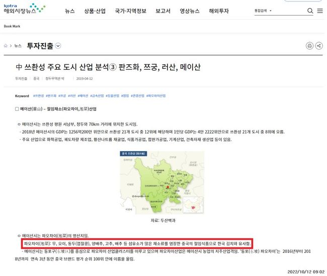 국회 산업통상자원중소벤처기업위원회 이인선 의원(대구 수성구을)이 코트라의 ‘해외시장뉴스’를 살펴본 결과, 지난 2019년 청두무역관에서 작성한 ‘中 쓰촨성 주요 도시 산업 분석’이라는 제목의 글에서 쓰촨성 메이산시의 파오차이 산업을 소개하며 파오차이에 대해 ‘무, 오이, 동두(껍질콩), 양배추, 고추, 배추 등 섬유소가 많은 채소류를 염장한 중국의 절임식품’이라며 ‘한국 김치와 유사함’이라는 표현을 사용하였다.